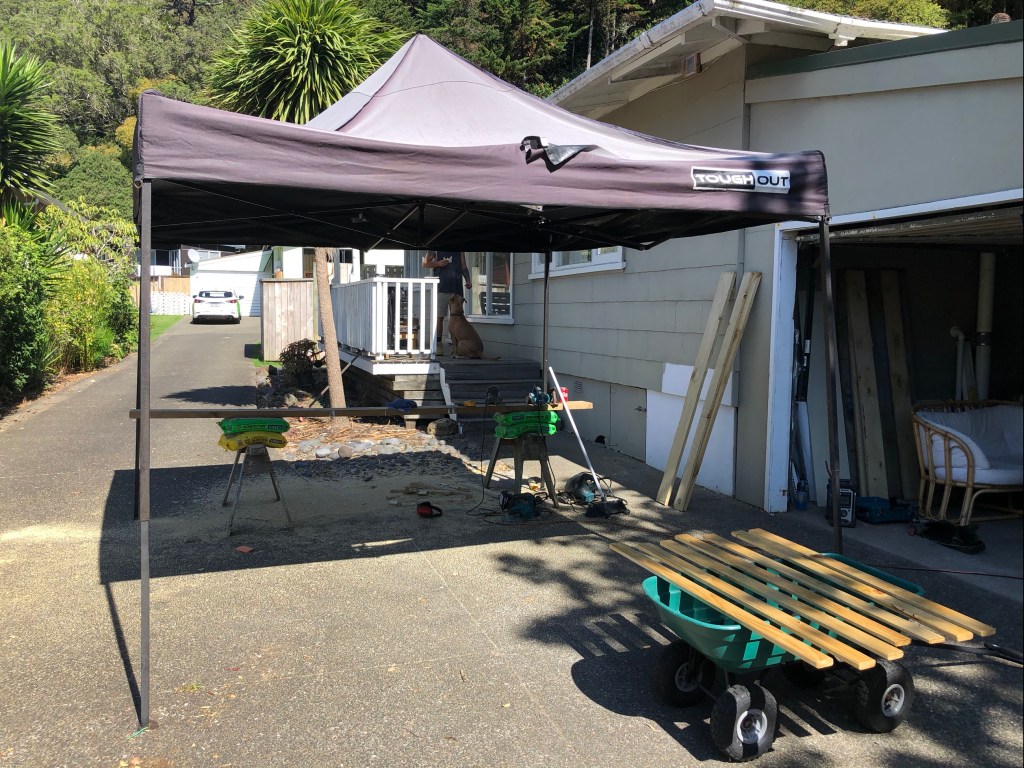 The workstation outside number 17 now sports the old gazebo for shade…amazing how much we are reusing and recycling when we can’t leap in the car and buy new…