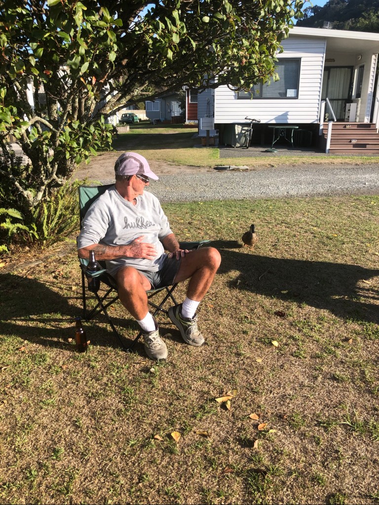 Limping Larry loves Len….hearing human voices was inspiration enough to leave the feijoa tree and limp across to visit….Larry thinks he’s human now all the ducks hang out at Waiwera place (down the road) on the berm and Larry lives under the feijoa tree in Riverhaven.