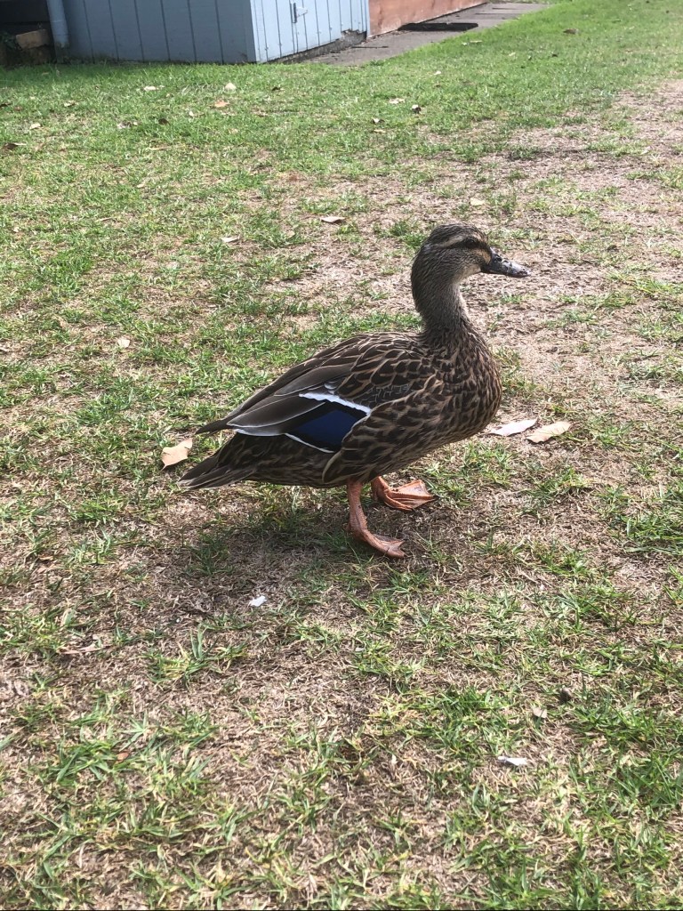 Limping Larry has been taking his morning bath, the other ducks (en masse) head up the road to the herd and Larry limps over (alone) to say good morning, en route to the feijoa tree