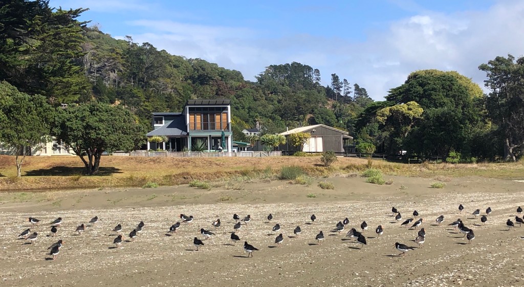 There was definitely a conference going on around the point! Nestled in hundreds, distinctive groups of oystercatcher birds! Same size, same shape, same red beak….one gathering all black and the other black tops with white bottom half!