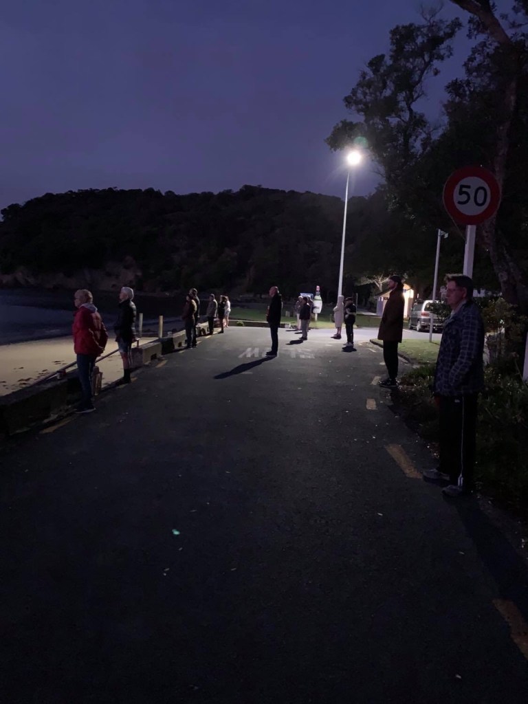 6am at the waterfront with Russell’s boom box, we listened remotely to the dawn service….there’s always one in the crowd, Trudi couldn’t quite get the heart!