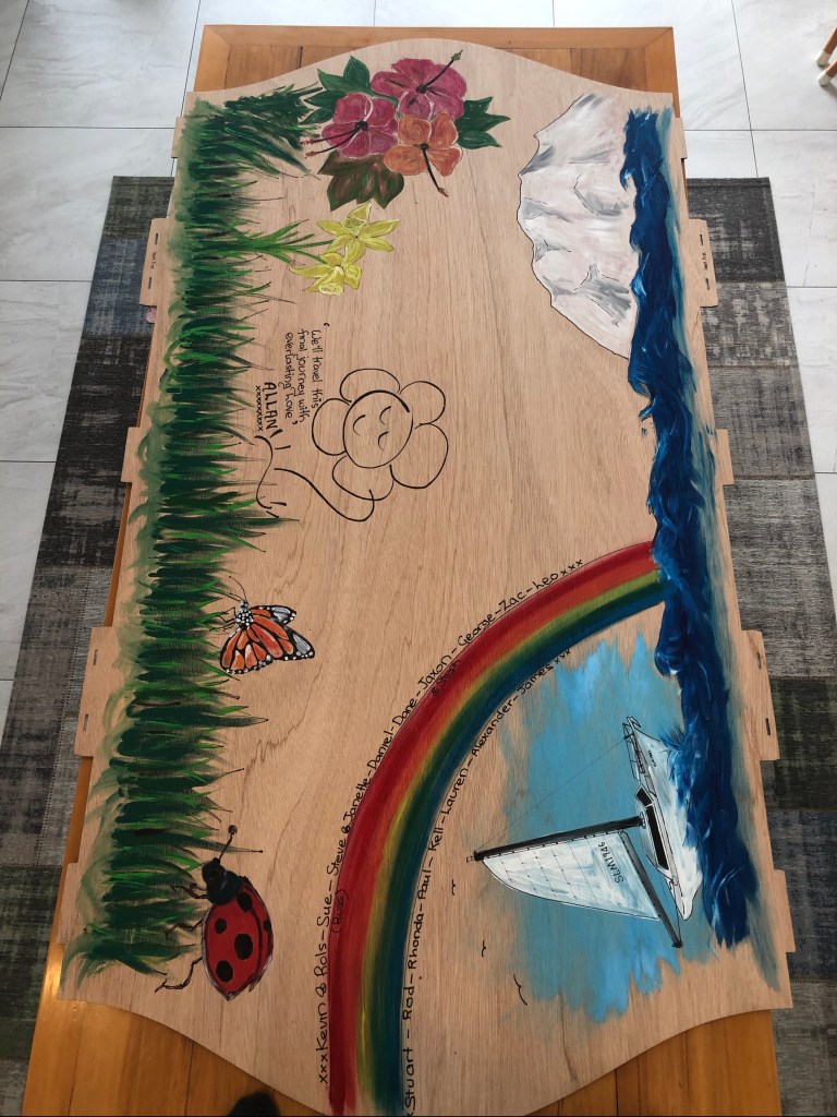 Daniel spent two days, second one under Dads direction, painting some of Sandys world on the coffin lid (chosen by Sandy, artwork directed by Sandy and Al)
