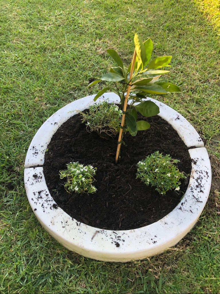 The compost got shoveled around the mandarin and lemon trees providing a perfect platform to poke the alyssum in “wherever I felt like it” …. as per Sandys instructions! The pots with dead plants on the deck got hauled by George around the back – another direction from Sandy and random dead plants and live weeds got disposed of, Sue, Al and George tag teaming!