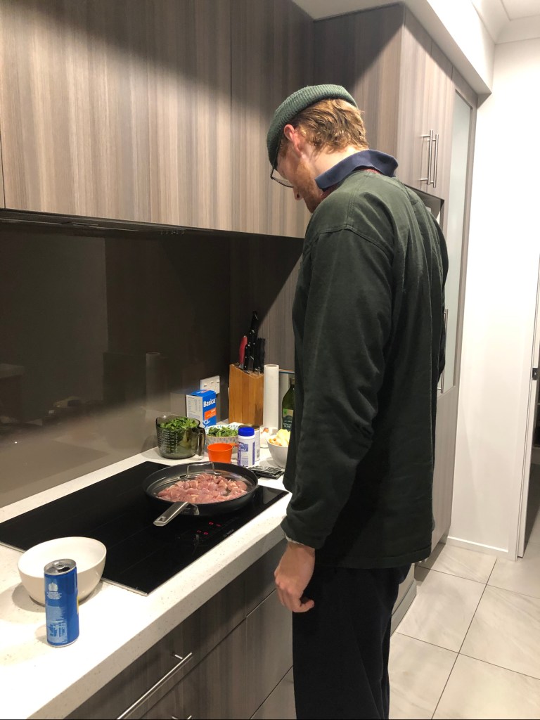 Trudi arrived around 4pm, being alone, she is our bubble extension in level 3, and assisted with round two of the “Hello Fresh” production…Keeping me company while I chopped, diced and prepared (an hourish) for a Sri Lanken chicken curry! George had taken a run around the estuary (11ks) followed by a bath (and a nap would have been in there somewhere) but he was on cooking duties!