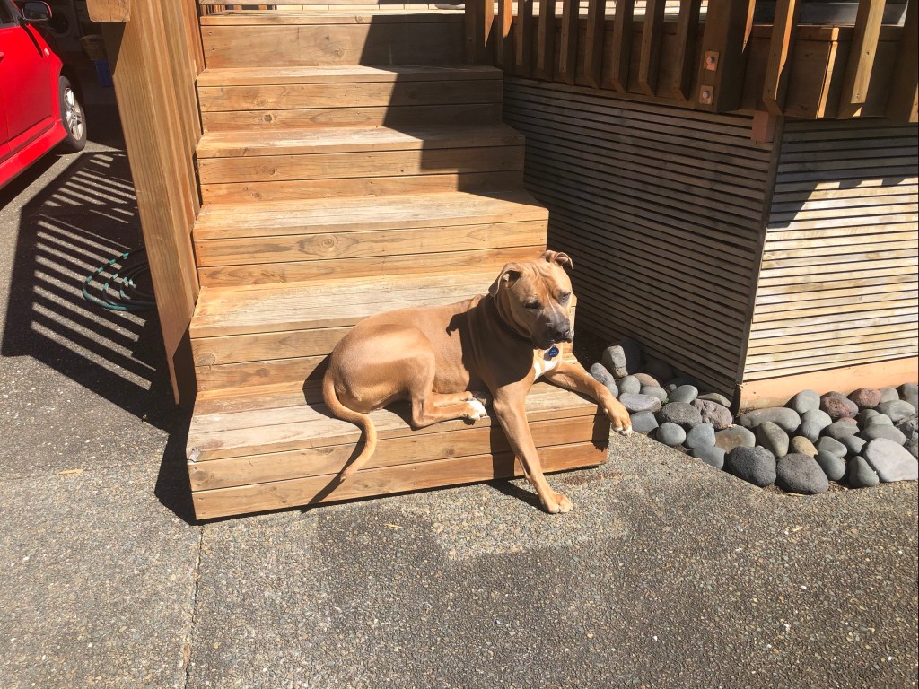 Floyd followed the sun…and moved to the bottom step of Jax house as the sun dipped behind the hill around 3pm.