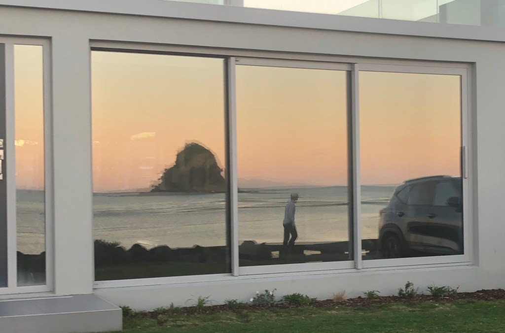 Reverse image of the sunset in the mirror of a waterfront home, capturing a loan walker and a clean car. With our water restrictions we are still unable to use the hose so most of us are sporting dirty cars so it is quite special to see a clean car.
