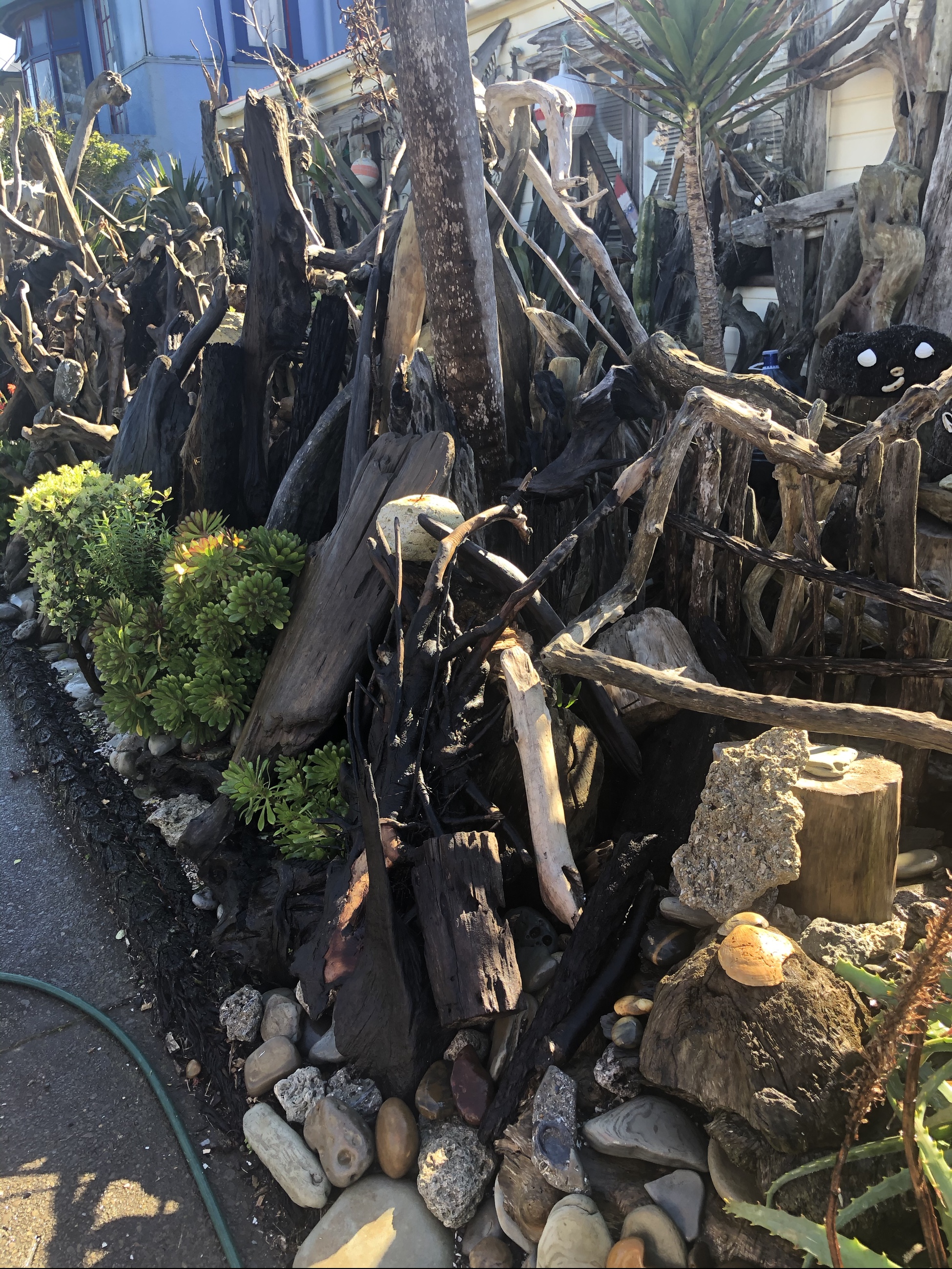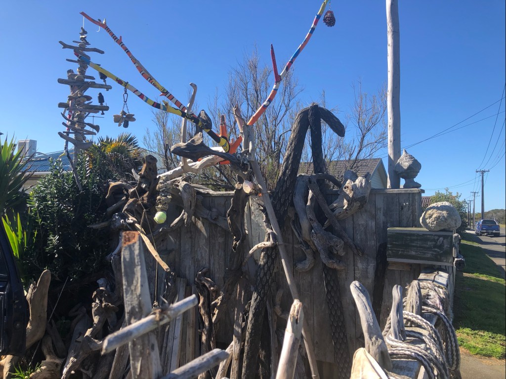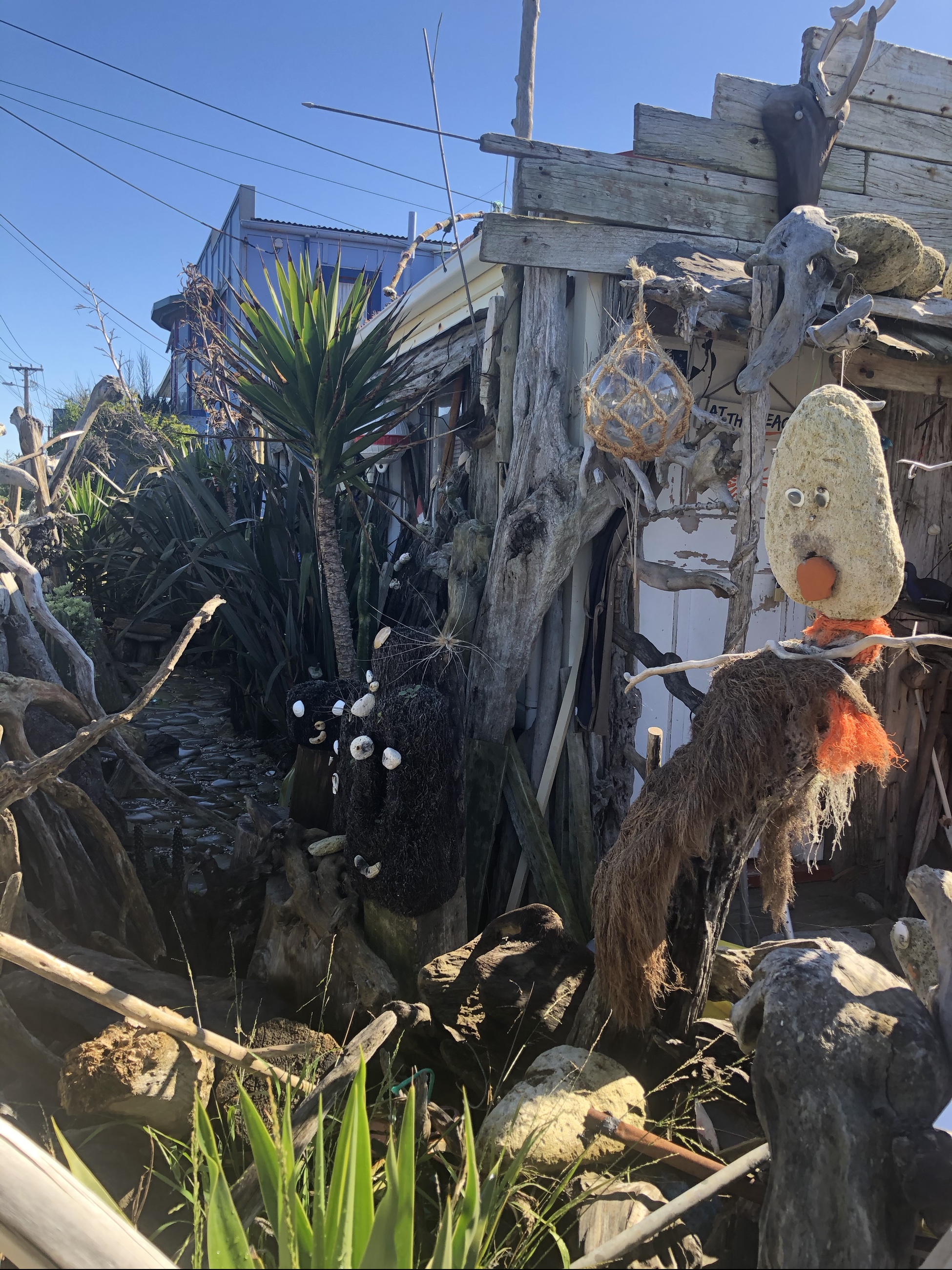 We very politely asked if we could take a photo. “Are you from the council?” No T & L are from north of Auckland and Louise is a driftwood fan. New best friend, the entire property is decorated with driftwood, a physical therapy project after a broken back left the owner almost paralysed.
