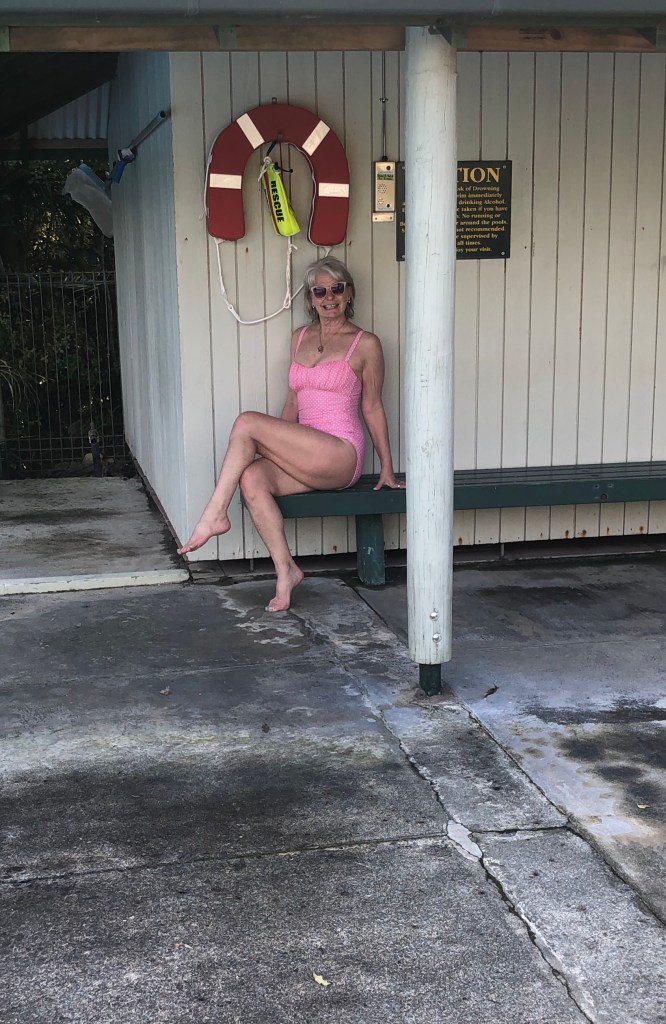 Donning the charity shop bathing suits, Thelmas like a corset and Louises a bit large and saggy (hence no photo)