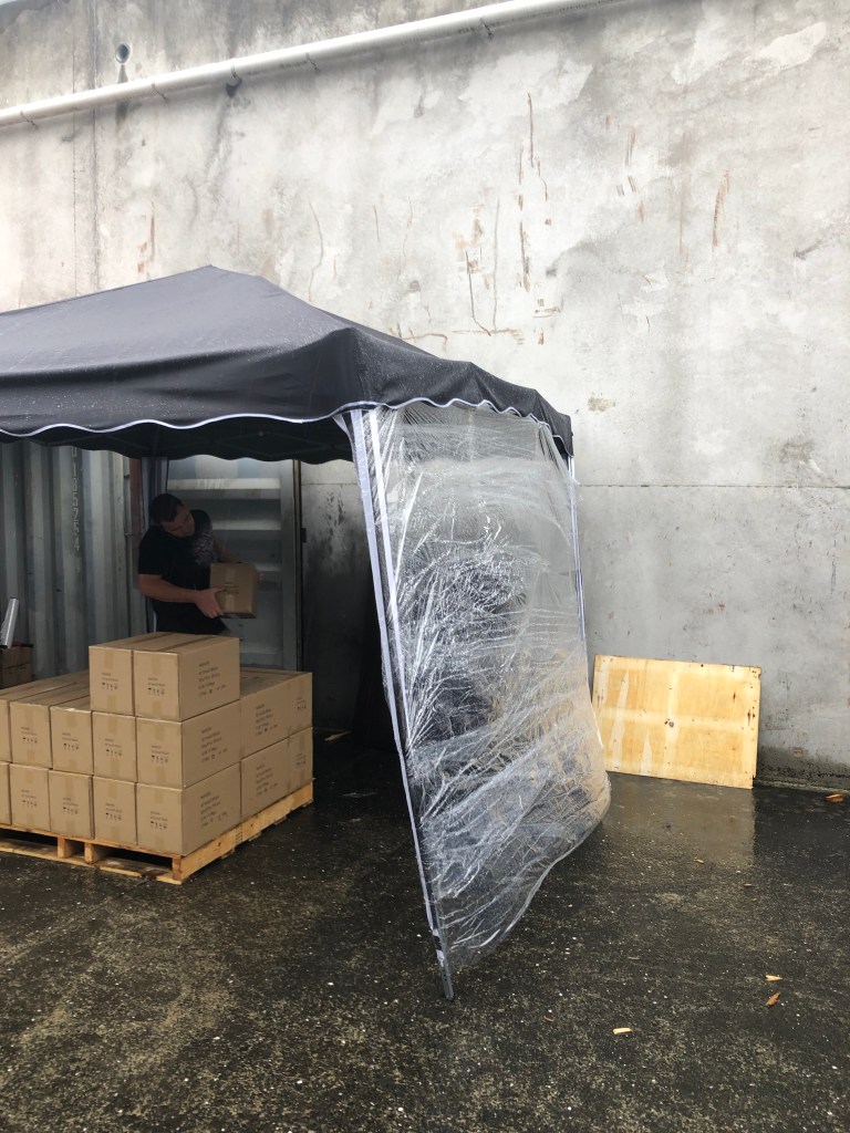 Unloading containers in the torrential rain called for kiwi ingenuity, building pallet wrap sides for the gazebo to protect our precious cargo!