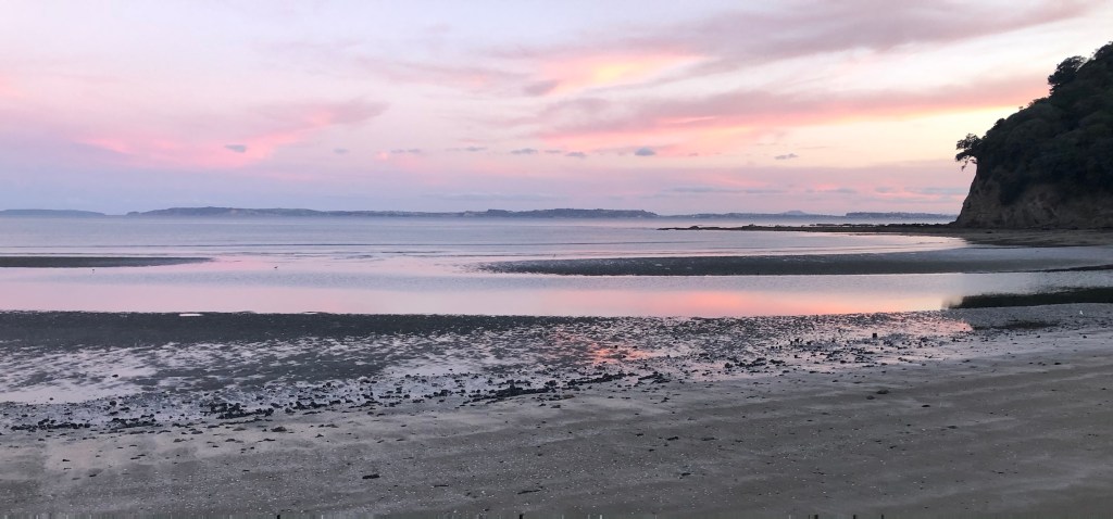 The colours of a Friday evening stroll along the beach are pink…and we check ourselves into a happy place.