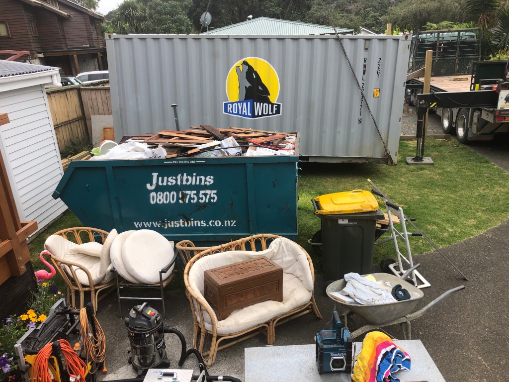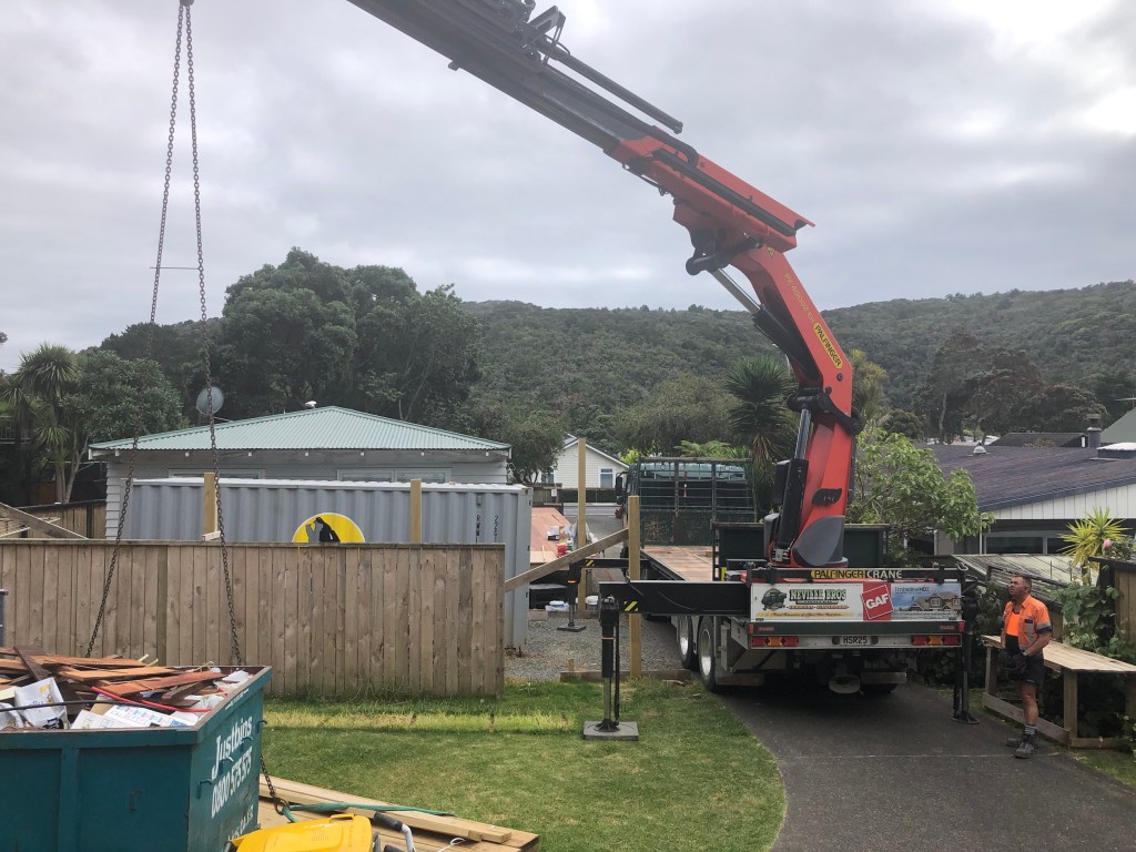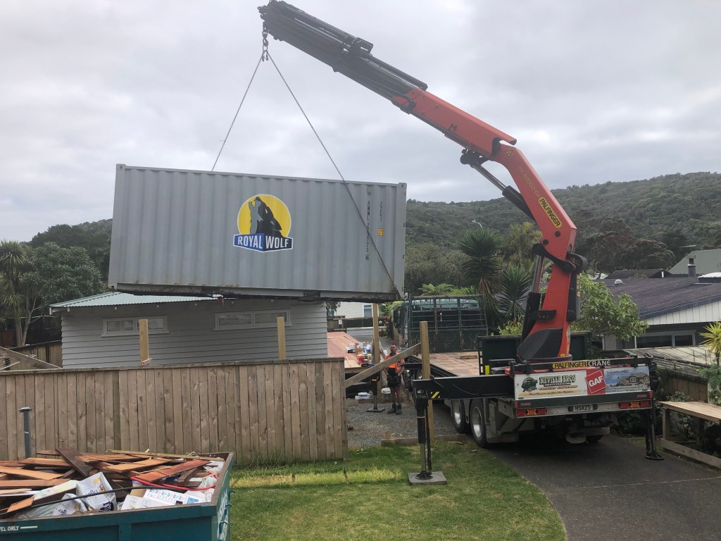 An 8.30am lift meant 6am work start for me, George popped in for a haircut – and it was all hands on deck (or moving decking timber) for half and hour before the Hiab arrived. The container was moving to my place to rub shoulders with the refuse bin (what a view!) Floyd and I safely on the deck…