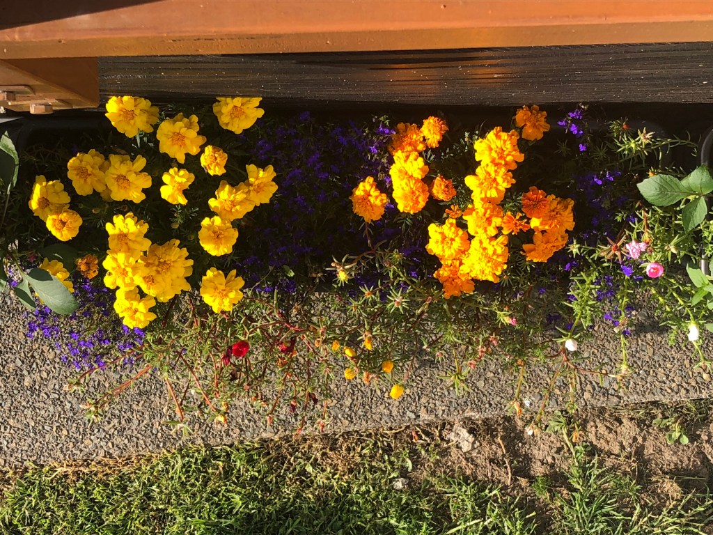 Playing water games with Floyd and the hose (keeping us cool) means the flower pots are surviving the summer heat and blooming despite their sunburn.