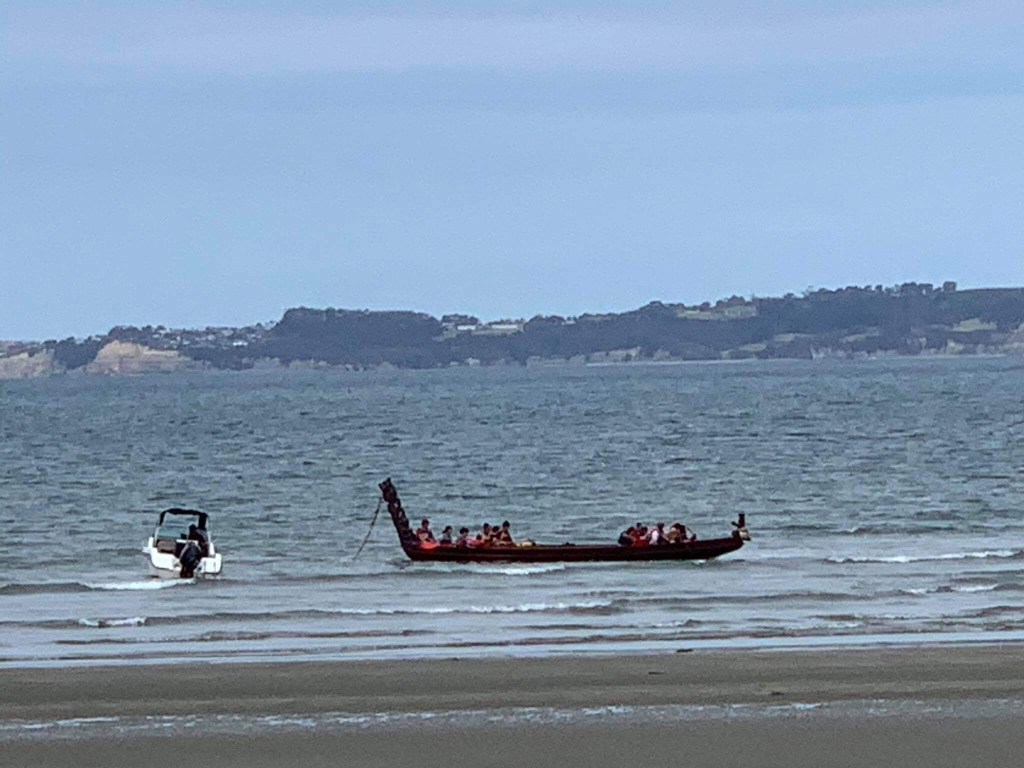 Not the usual motor boat or jet ski – a Maori Waka! Calling in to say hello before paddling off towards Orewa! Life is always full of surprises in our sleepy little village!