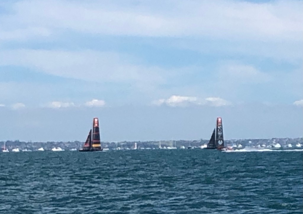 The closest we got to these massive sailboats was when a training Team NZ flew past our moored boat – looking large and fast!