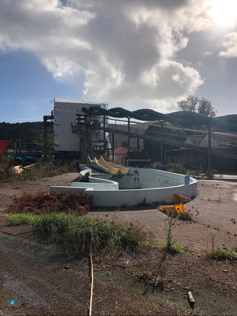 A gap in the gates of what used to be the very popular Waiwera Thermal Resort displays a sad ending to a long running tourist and fun destination for many NZers and tourists…two (ish) years ago it closed its doors for renovations and never reopened due to questionable management culminating in liquidation and a very long court case. So in the middle of Waiwera stands (or crumbles) a derelict waterpark surrounded by high walls with faded and peeling paint!