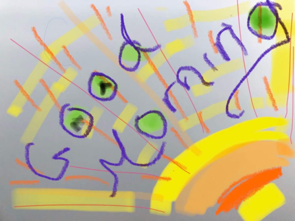 I was going to get up early and catch this mornings sunrise, but rain splashing on the concrete outside the bathroom window changed my plans…found this last picture on my phone (accidental snap) that sums up the morning – if you remove the impressive artwork! Yes it’s a grey morning as predicted…yesterday was quite busy, off and on, with work communications, therefore my exercise was closer to home – a street and beach (at low tide) circuit