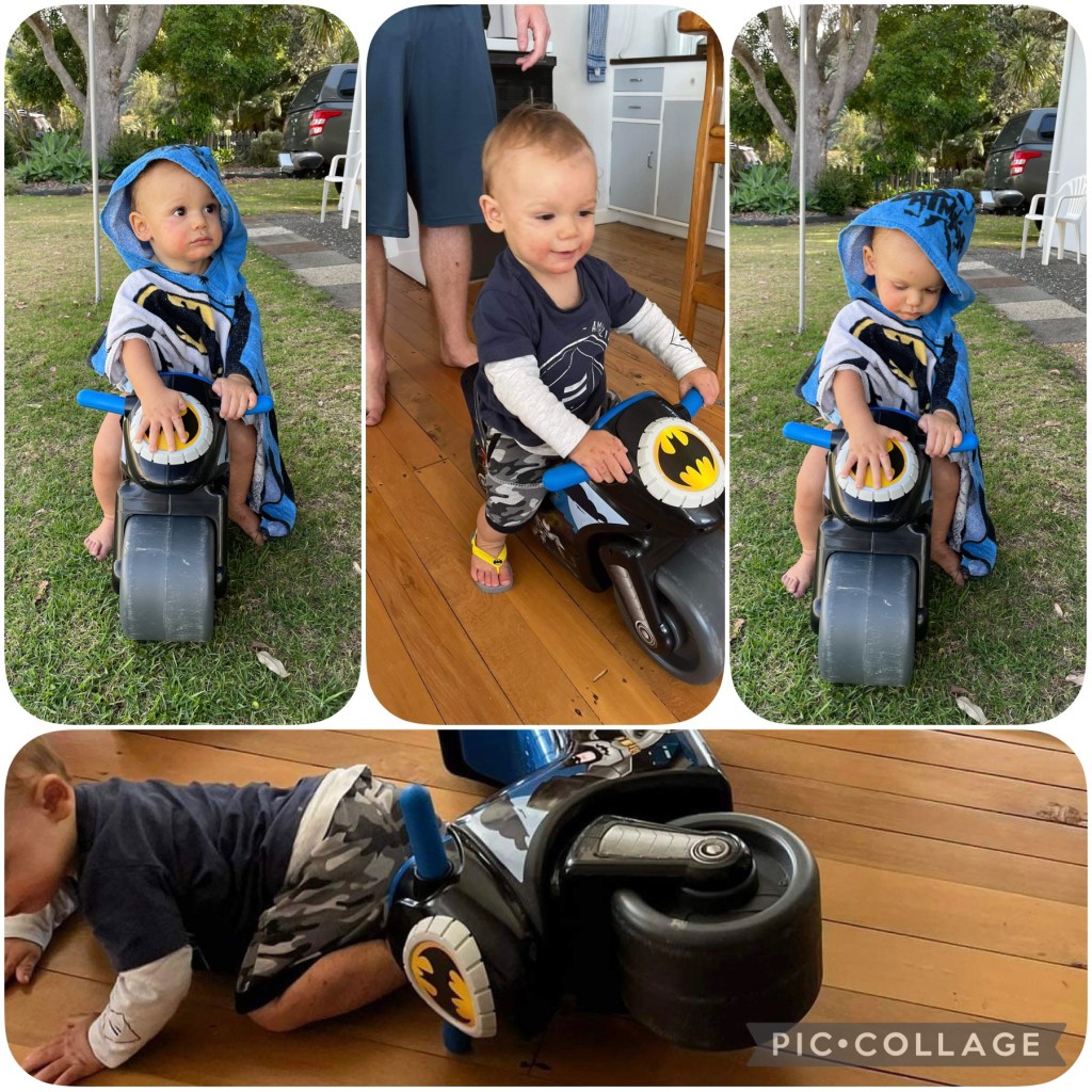 Batboy mastering his Batman bike….as he nears the end of his first year, he has found his legs can run, jump and climb and his world is a busy place in between breakfast, lunch and dinner, daytime naps and nighttime sleeps!