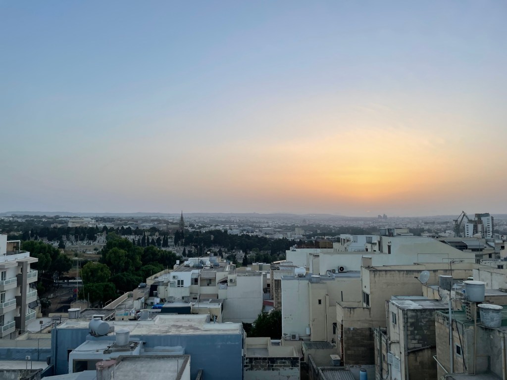 Actually the sunset from the night before! However at 6.30am I opened the window on the shaded side and the air coolish – probably around 30 degrees. Not for long….the temps heating up and tried to close and crank up the air con, as I was sitting on my bed working quietly while the rest of the house was sleeping. Tried to close….jammed open! Oh well next mission was to print out some info for work…trying to find the paper loading slot…Jammed open the top of printer. Not wanting to force the issue (and break something) realised that it still printed in this position. Minimalising the stress levels (getting rather hot with the jammed open window) I quietly carried on with my work morning! Kev appeared an hour later and I told him (in my now hot sweaty state) that I was in a bit of a pickle! A flick of a lever – the window closed, and a bit of brute force the printer closed! At least I hadn’t broken anything – another lesson in Maltese technology! Rols was getting ready for work and Kevin had teaching from midday,