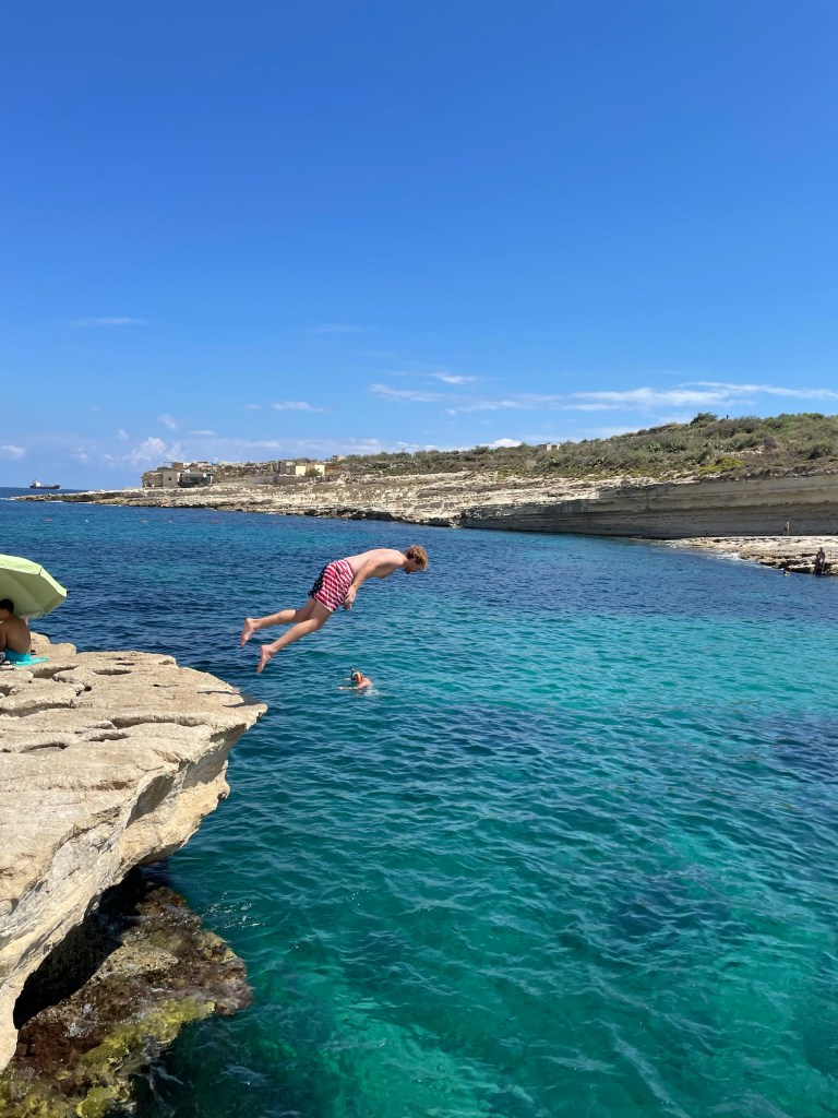 George diving off the rocks – I jumped off the ladder, mindful that the Maltese bikini may not survive the higher impact!