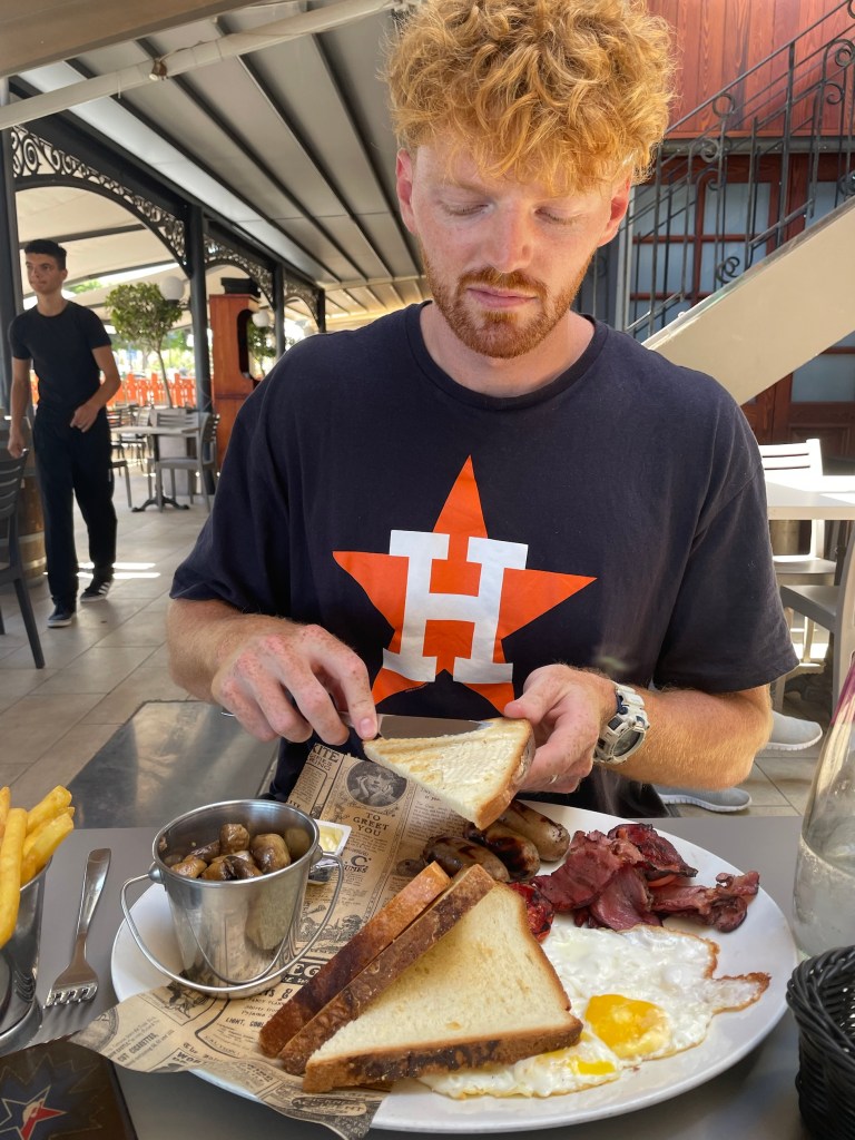 Water sorted, thank goodness, and cable TV looping on a Dynamo advertisement, so no second half, George and I finally headed out for a late breakfast/lunch….