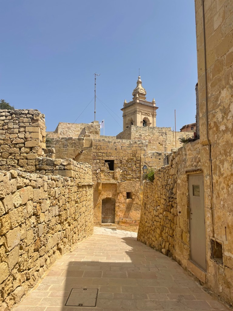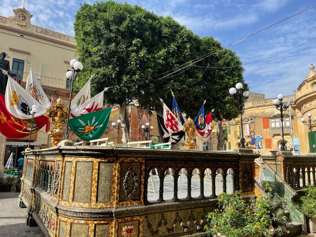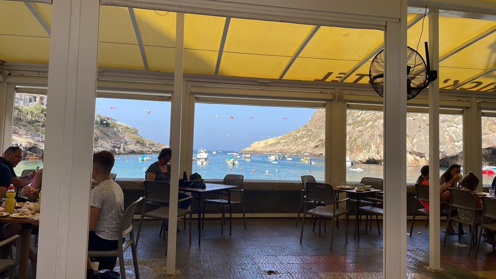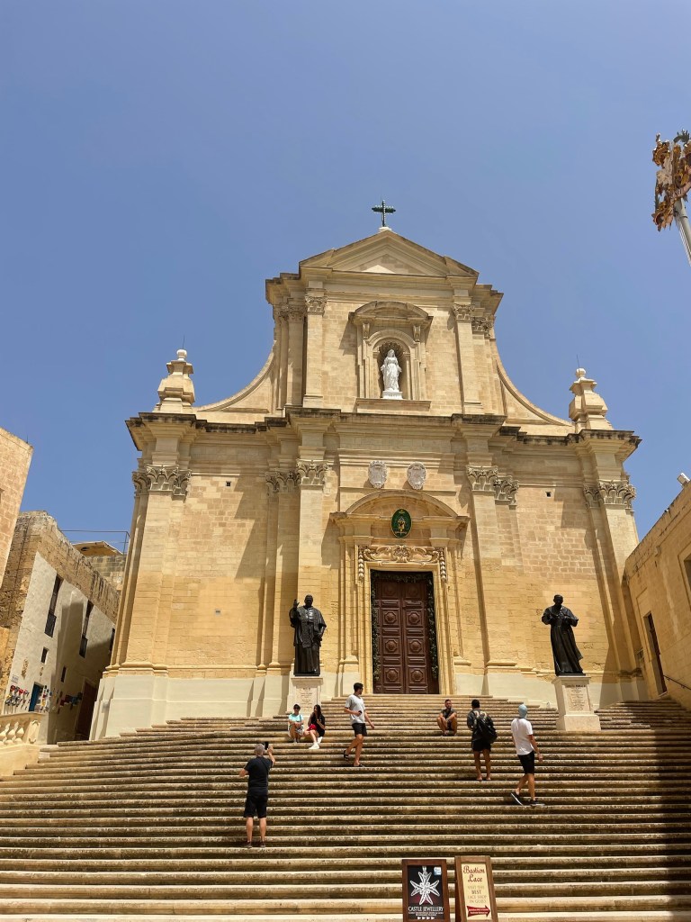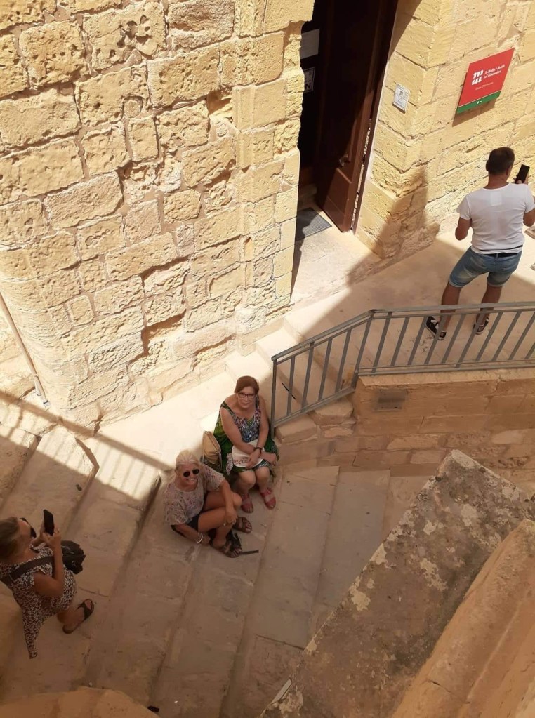 Then the shops all opened at around 9.30…having Anna as our local guide, we explored new areas and shops poked away from the main drag (yes heating up and dripping!) And fabulous Gozo treasures…I even found the often visited charity shop still going strong even after the Covid struggles! The morning disappeared into a blur of diving in and out of the airconditioned shops -and around midday we sat down(in a cafe under a fan) for a lunch of shared pizza! Then the next activity was the Cittadella (basilica of Gozo) –
