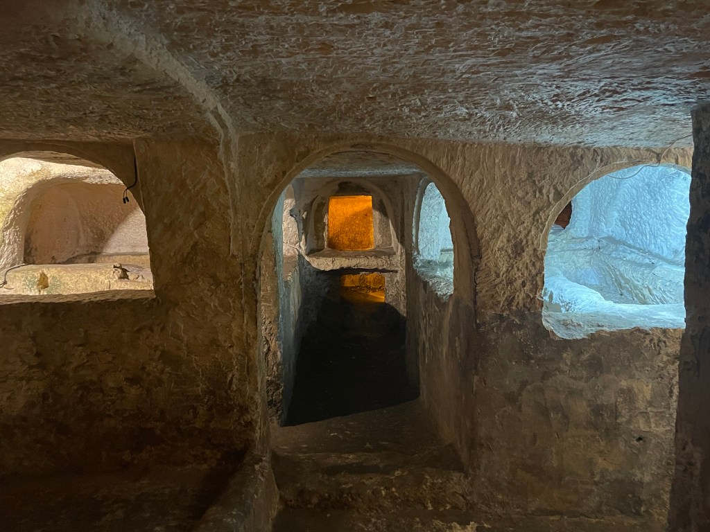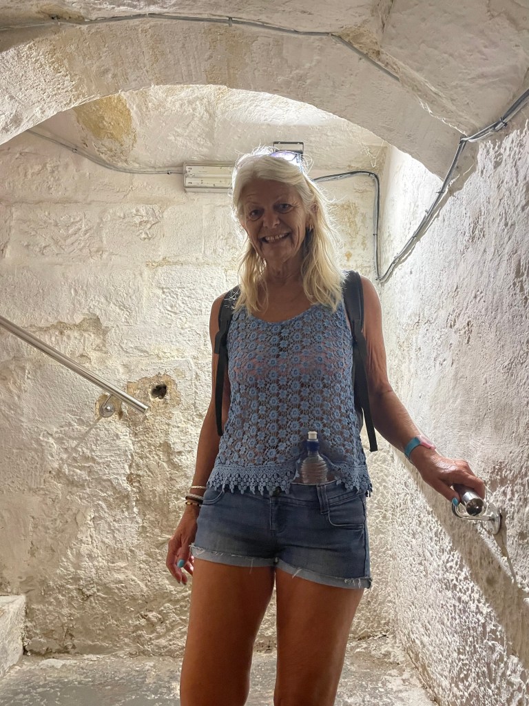 Then off to the Grotto, the catacombs and the underground shelters of St Paul’s Church. For a mere senior citizens rate of €3.50 each Jill and I spent the next hour under ground (becoming a habit) exploring: