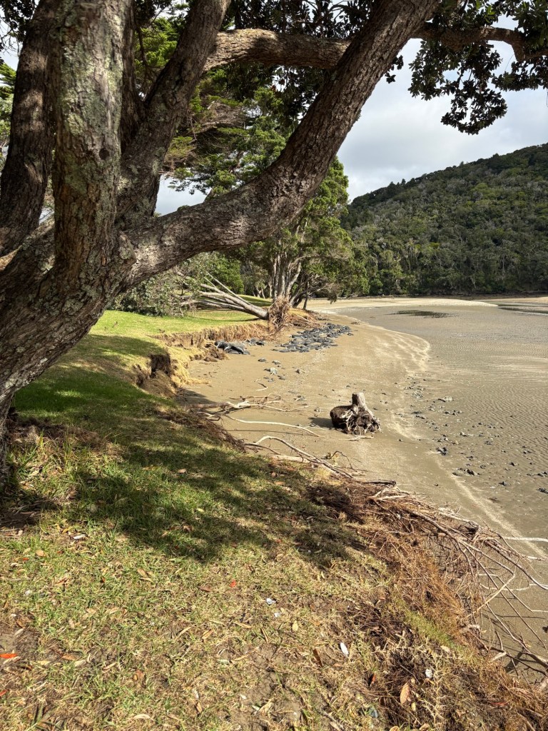 The pōhutukawa trees on the Waiwera waterfront sadly lost their foothold in the eart and some tumbled into the sea…as the easterly winds sent waves battering the the sea wall!