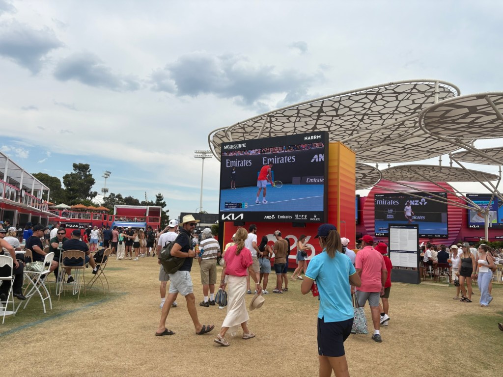 I joined the throngs of people all going somewhere! I managed to find a seat in an outside court with some unknown players and thousands of others!!! My claustrophobia kicked in … was getting a bit hungry and thirsty so headed back to the arena, with a full water bottle at least!