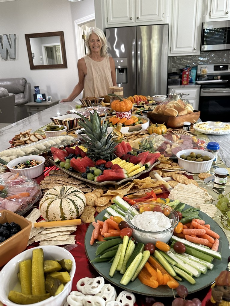 Expecting 20 Adults and seven grand babies, Chuck prepared the pool toys and Tona and I built our table of food! With the Fall theme….around five the party began! And the girls added to the spread…