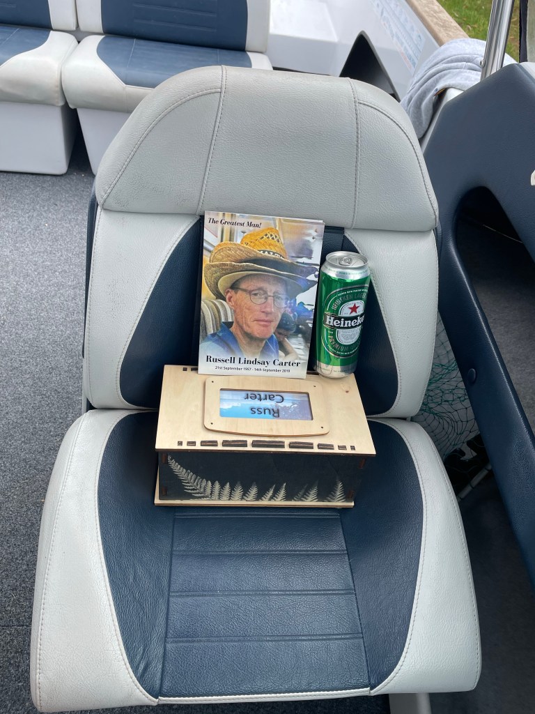 Russells family was up at the end of November and we took the opportunity to take Russ (ashes) on his final journey to his favourite fishing spot, having to pick the day and change it at the last minute, as the day of choice promised to be a rocky boat ride. The save a day was perfect and dropping Russ’s fishing rod in the spot – he caught 6 fish in 10 minutes! Possibly a record for Russ!