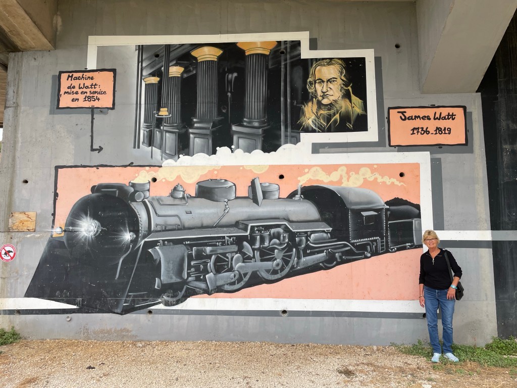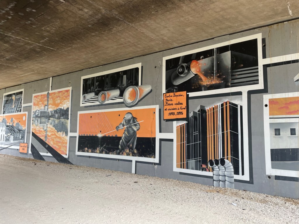 With murals telling the story of the original lifeblood of Fumel – the now closed steelworks, which even supplied parts of the Eiffel Tower in Paris when it was being constructed.
